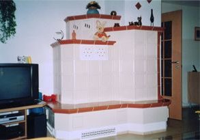 Kachelofen-Luftheizung mit beheizbarer Sitzbank, Schamottezügen und einem zurückgesetzten Kachelaufbau