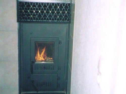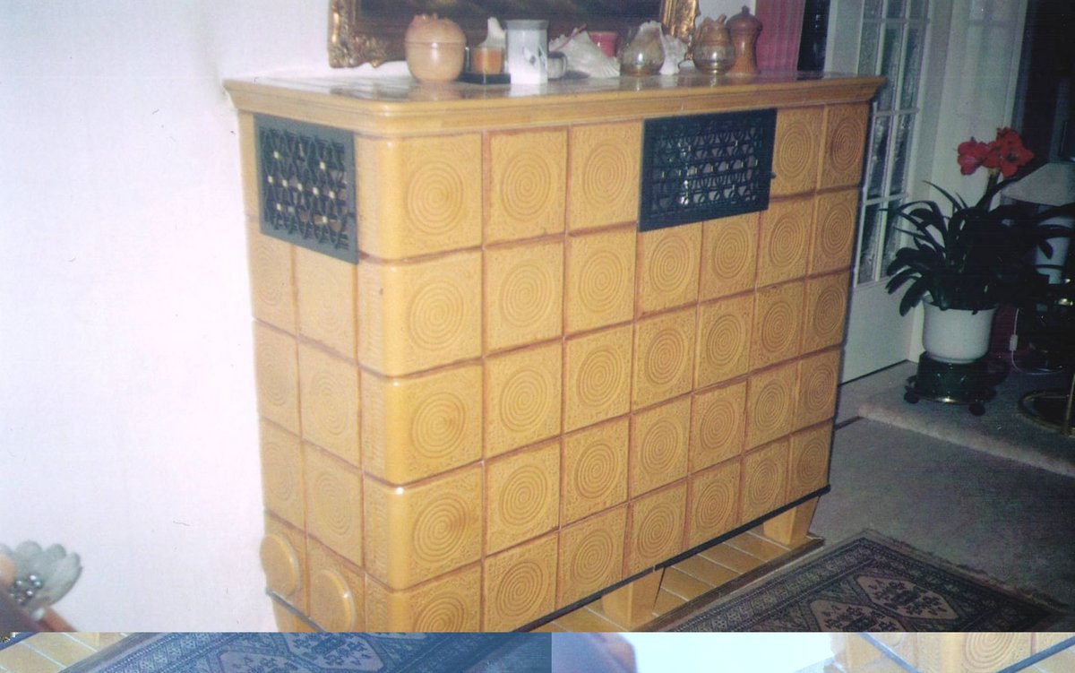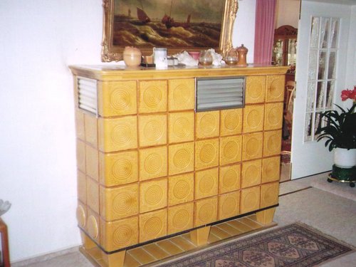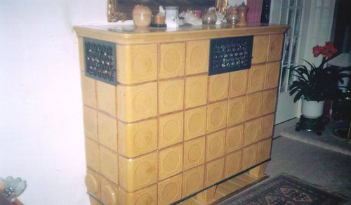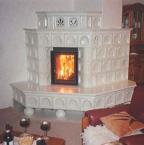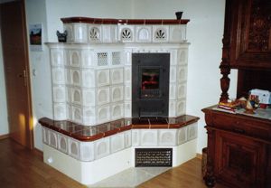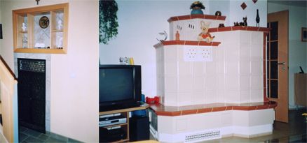 Kombination aus Kachelofen-Luftheizung und Kamin mit Heizeinsatz, der mit Holz, Briketts oder durch Umstellung mit Öl befeuert werden kann. Mit beheizbarer Sitzbank, Schamottezügen und zurückgesetzt aufgebautem Kachelaufbau